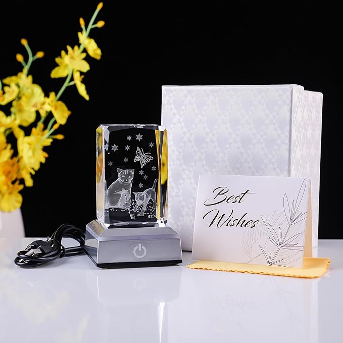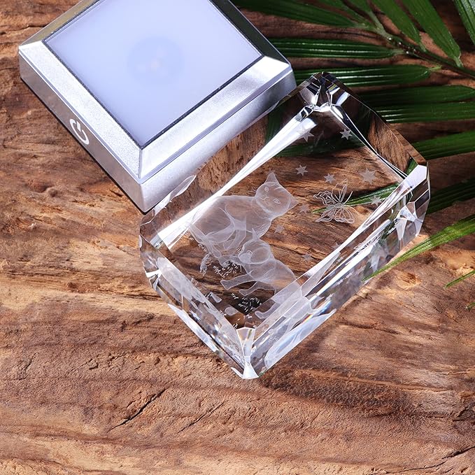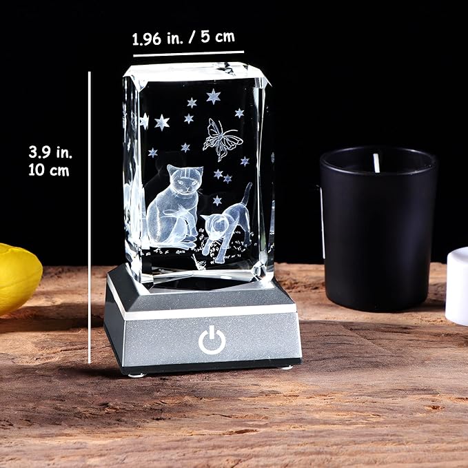 - Quality Crystal and Exquisite Crafts - Each block is made high-quality K9 crystal, it is cut and polished into rectangular blocks with small cut surfaces without any bubbles, impurities or scratches. The pattern in the blocks is: a big cat and a kitten, the kitten is catching butterflies, there are some stars and butterflies around them. These two lofelike cats are 3D, engraved inside blocks by advanced laser machine, it is Optically Clear, which makes it perfect for Showcasing 3D Engraved Images.