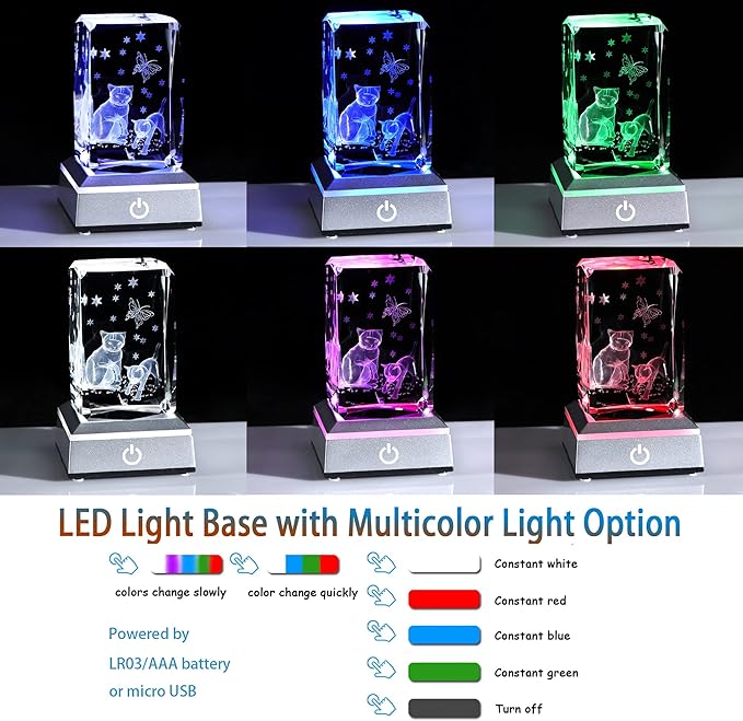 - Colorful Light Base - Each crystal is equipped with a LED light stand. The light of the LED base can change color automatically or fixed color, and it will make the pattern of the cat figurine clearer, especially in a dark environment, even you can use it as a night light. The light base has two models of power supply, one is using 3 AAA 1.5V batteries, another one is using the charging cable (the package doesn't include battery and plug), you can use the cable to connect the computer, car or portable charger
