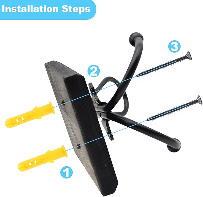 - 【Package included】2 pack of black metal robe hooks and wooden board, 4 screws, 4 wall anchors and 1 package box. (Note: Purely handcrafted wood blocks, each batch of wooden bases will vary slightly in color and texture)