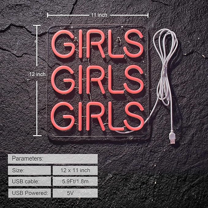 - Girls neon sign SIZE is 12”x 11'' ( 300mm x 280mm). USB Cable length: 1.8m ( 5.9 ft).The color is as shown in photos, It is with dimmer switch on the cord.