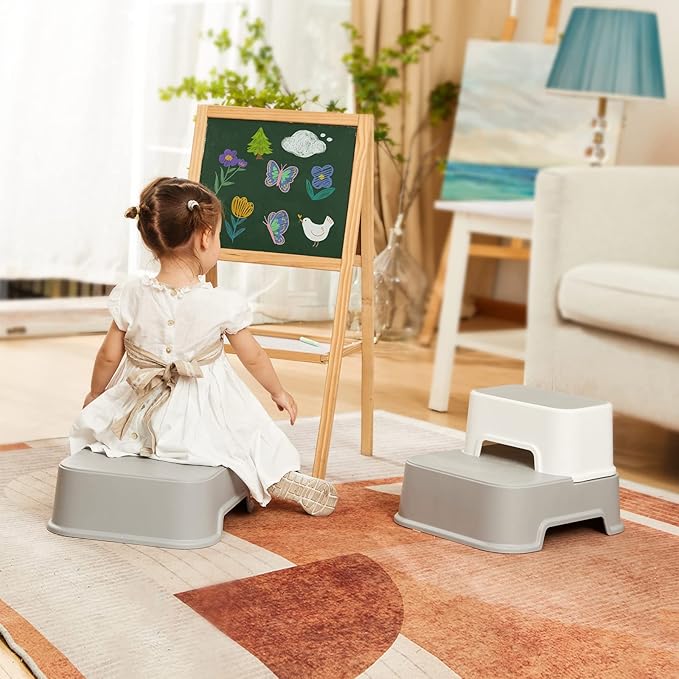 - ❤️❤️ MULTI-FUNCTIONAL:It's so helpful for toddlers and kids – in the bathroom, home and kitchen.Our dual height design with wide steps help toddlers step their way up to independence as they transition from toilet potty training, to washing hands and brushing teeth at the sink, to finally reaching counter tops and cabinets in your home and kitchen. The stool feet perform best on clean, dry, oil-free floors.
