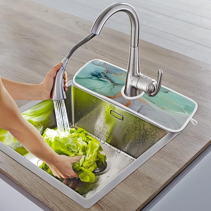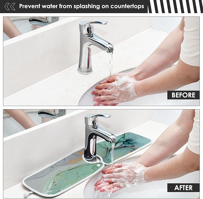 - DECORATION FOR KITCHEN BATHROOM: Using these Faucet Splash Catchers with our unique design, timeless color and seamlessly blends into your home to create perfect Sink Accessories, add a touch of luxury in your kitchen&bathroom will give your house an amazing makeover and elevate your home decor.