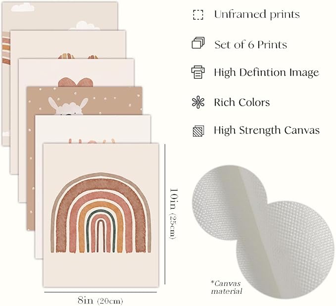 Canssape 6pcs Boho Baby Room Decor Poster, Canvas Wall Art Prints, Rainbow Nursery Wall Decor, Unframed Kids Wall Decor for Baby Girl Room Art, Heart Color, Animal Theme, Watercolor, 8x10 inch
