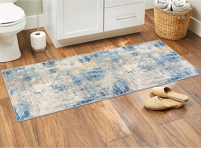 Lahome Modern Abstract Blue Bathroom Rug, 2x6 Washable Long Hallway Rug Soft Non Slip Blue Floor Accent Carpet Runner for Entryway Kitchen Laundry Room Doorway Bedroom