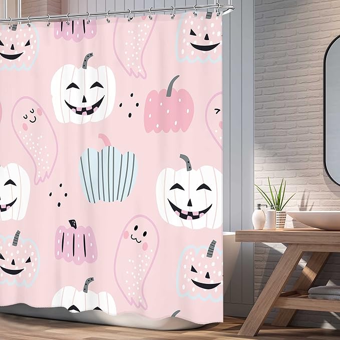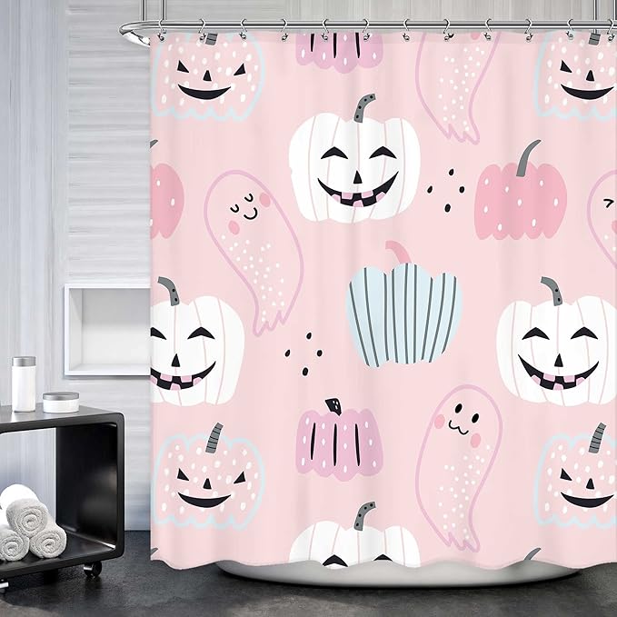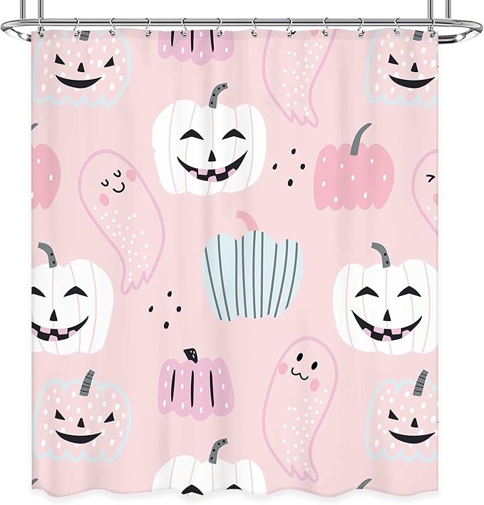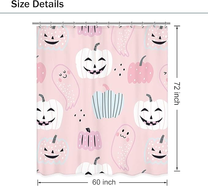 Pink Halloween Pumpkin Shower Curtain 60Wx72L Inch Cartoon Cute Ghost Kids Shower Curtain Bathroom Set Funny Spooky Girl Child Trick or Treat Bath Curtain Bathtub Accessories Home Decor