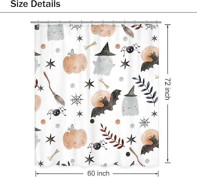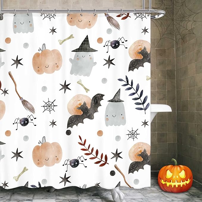 Halloween Kids Shower Curtain 60Wx72L Inch Cute Cartoon Ghost Pumpkin Shower Curtain Bathroom Set Bat Spider Web Wizard Hat Funny Stars Leaves Bath Curtain Bathtub Accessories Home Decor