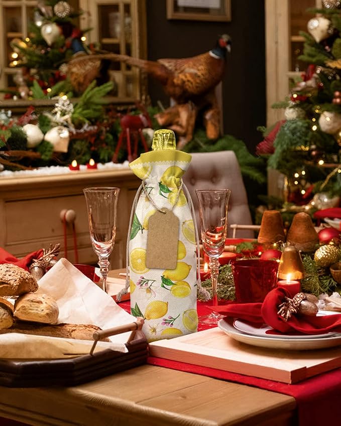 10 Pack Wine Bottle Bags, Summer Lemon Wine Bottle Cover with Drawstring, Yellow Tropical Lemon Spring Floral Gift Bag for Champagne Wedding Birthday Party