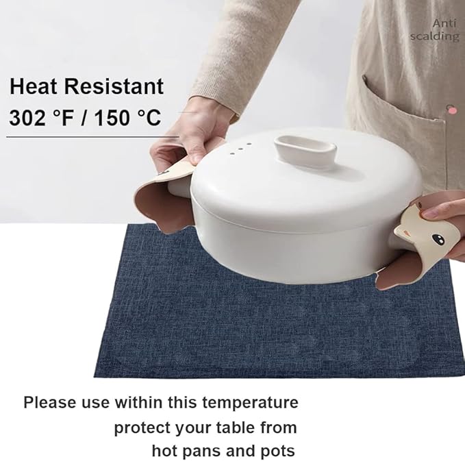 - Double Layered Fabric - Each placemat has double layers and both sides are usable. Its thickness is appropriate for protecting the table form hot plates,stain,scratches and some water droplets spilled from tableware.NOT waterproof