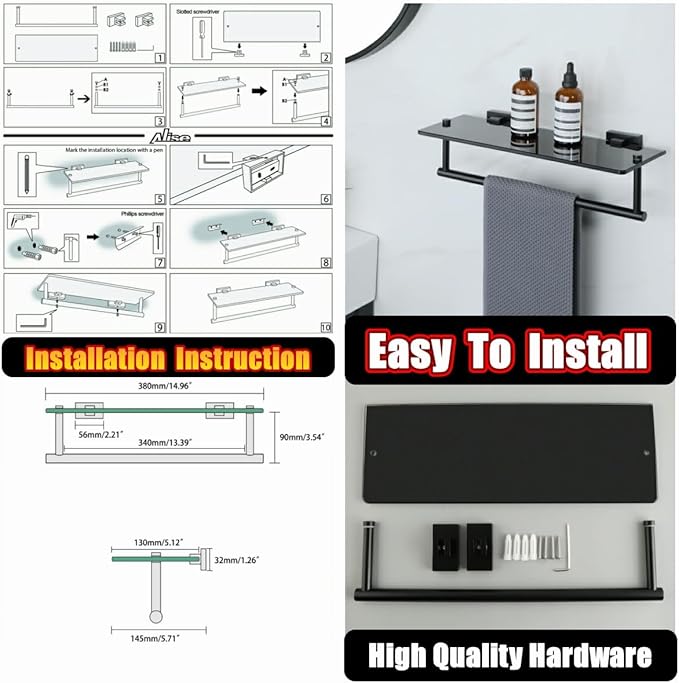Alise Bathroom Shelves Glass Shelf with Bar,Wall Mount Floating Shelves for Bathroom,1 Tier Tempered Glass Holder Rack Storage Organizer,SUS304 Stainless Steel GOY6380-B Black