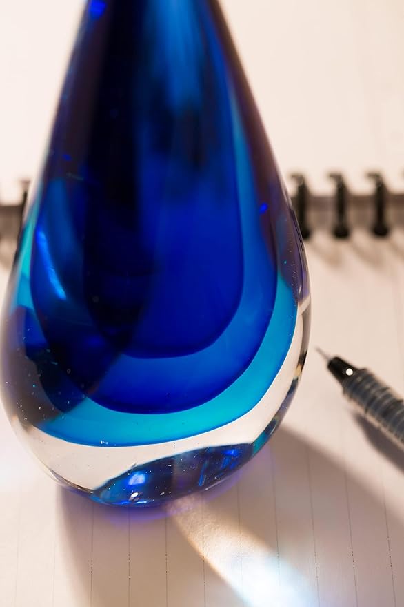- [Design Features] Art glass sculpture is designed with teardrop, uses brilliant colors. The transition from light blue to dark blue, showing a gradual effect., shaped like a waterdrop. It has rich contemporary home features