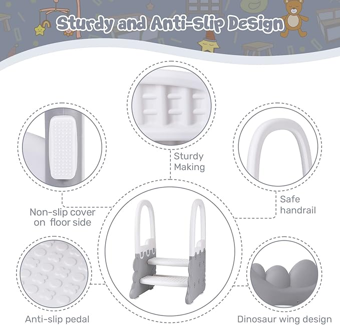 - 💯 Unique 2 Step Stool: Ronipic toddler step stool is designed for better caring on kids, the handrail and dinosaur wing can bring kids much sense of safety, thus babies are able to apply the stool from walking-learing stage, the white and grey combined step stool is so stylish and easy to match home decor.