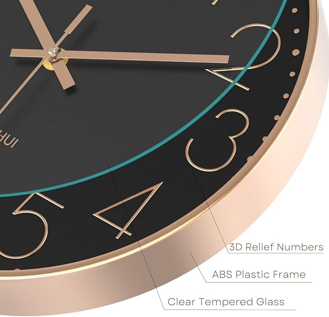 - EASY TO READ 12" WALL CLOCK: Designed with 3D relief rose gold numbers set against a black background, the SUOHUI silent wall clock ensures exceptional clarity. The high-transparent glass cover provides added protection while enhancing the clock's elegant look, making time-checking effortless from any angle.