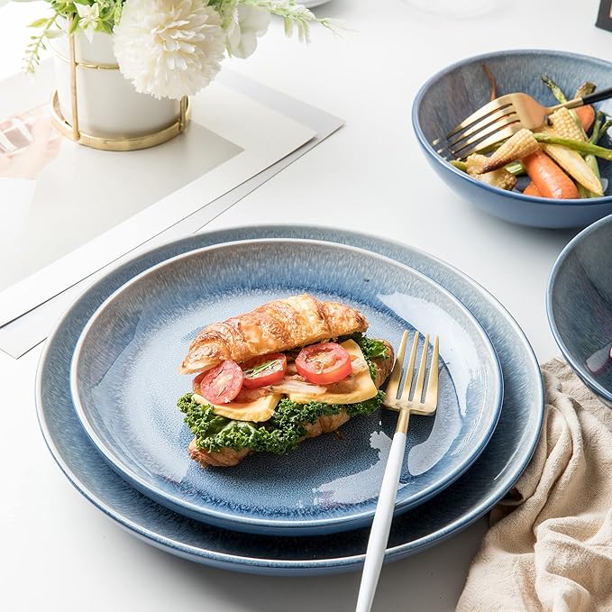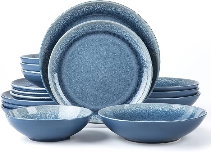 FAIT Round Stoneware 16pc Double Bowl Dinnerware Set for 4, Dinner Plates, Side Plates, Cereal Bowls, Pasta Bowls - Reactive Glaze Blue (449322)
