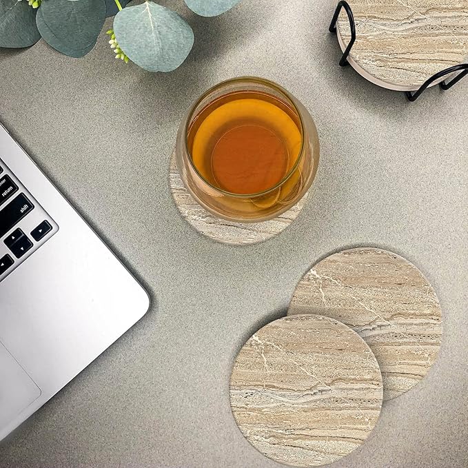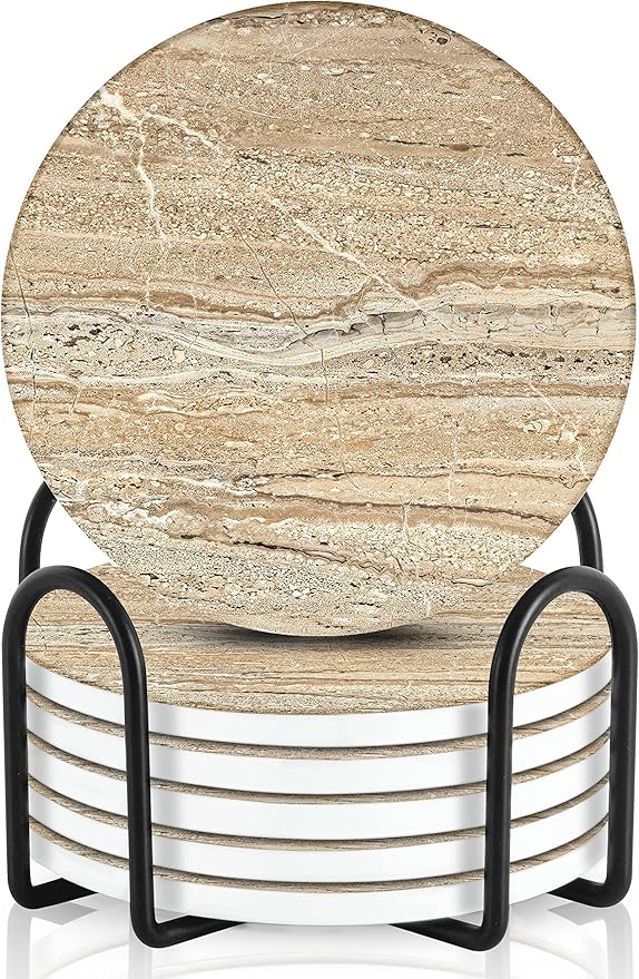 Emerson Coasters for Drinks Absorbent – Natural Stone Drink Coasters Set with Holder, Coasters for Coffee Table, Wooden Tabletop Protection Marble Style – 100% Heavy Duty Set of 6 (Sandstone)