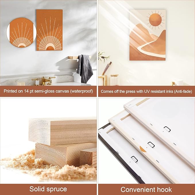 - 【High-quality Canvas Print Wall Art】Boho framed wall art printed on high-quality 14 pt semi-gloss canvas, comes off the press with UV resistant inks, waterproof, sun-proof, fade-resistant and tear-resistant, no odor, can be used for a long time, very suitable for indoor and bathroom use.