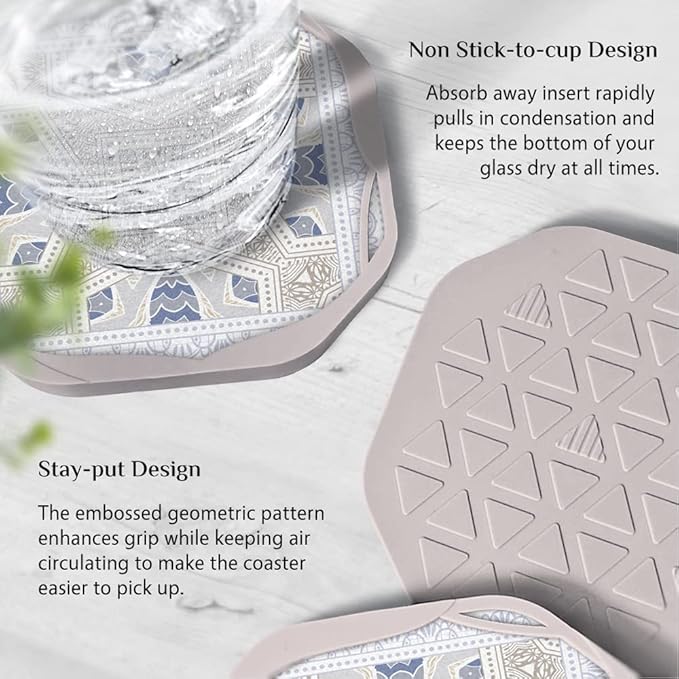 - HYBRID SILICONE AND FELT - It combines the best of both materials for a lightweight yet durable, all-purpose coaster. The non-slip silicone base keeps your cups in place while the super absorbent felt insert soaks up any moisture from your glass. In addition, the decorative case has a pretty lip with charming reliefs around the edges, which nicely frames the tailored insert, preventing it from popping up