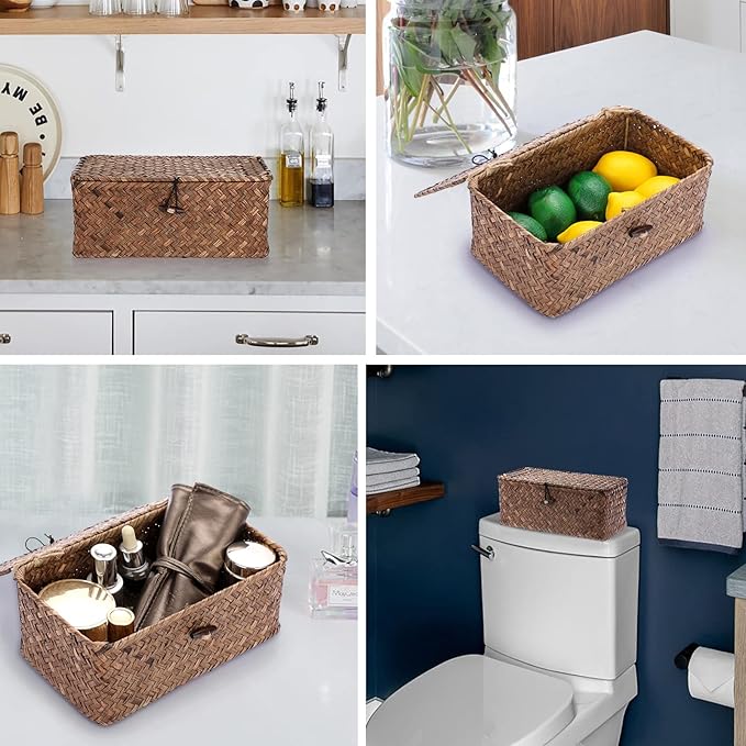 Hipiwe Wicker Shelf Baskets Bin with Lid, Handwoven Seagrass Basket Storage Bins Rectangular Household Basket Boxes for Shelf Wardrobe Home Organizer, Coffee X-Small