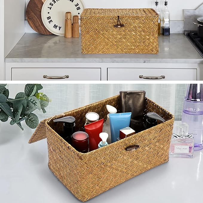 Hipiwe Wicker Shelf Baskets Bin with Lid, Handwoven Seagrass Basket Storage Bins Rectangular Household Basket Boxes for Shelf Wardrobe Home Organizer, Caramel Medium