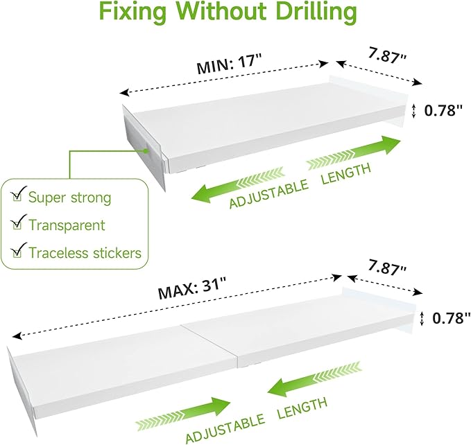 - Expandable Design: This pantry shelf adopts a metal sheet structure with adjustable length from 17 inches to 31 inches. Available width is 7.87 inches. Please note that the length of your closet should be within 31 inches. Please confirm the size you need before purchasing