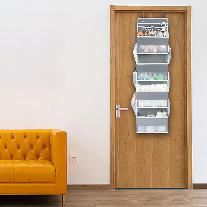Univivi Over the Door Organizer, 5 Shelf Door Hanging Organizer Nursery Door Storage with 4 Large Compartments and 2 Small PVC Pockets 6 Side Pockets for Bathroom,Cosmetics and Nursery Baby Essential