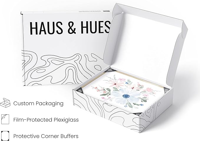 - PREMIUM WALL ART: To achieve the craftsmanship we’re known for, we use a printing technique on 14 pt semi-gloss paper. The paper used for our living room wall art is sustainably sourced, and our inks are water-based. The flower wall art is equipped with plexiglass covered by protective film and two metal hangers for horizontal or vertical hanging. The floral wall art is shipped in a durable box for protection in transit.