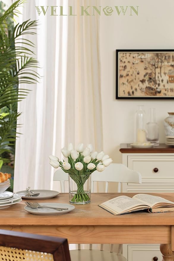 - 【Softer Real Touch Fake Tulips】 The real touch tulips in vase are made of quality PU material. Real touch, realistic and natural looking, especially the Petal Feel. The faux white tulips feel real and have a super natural look.
