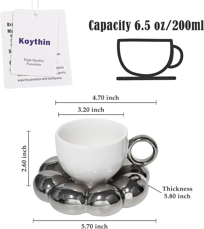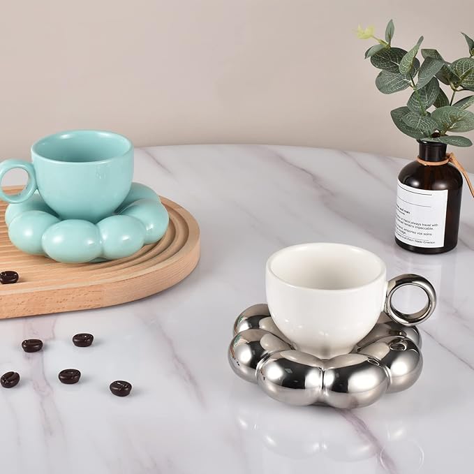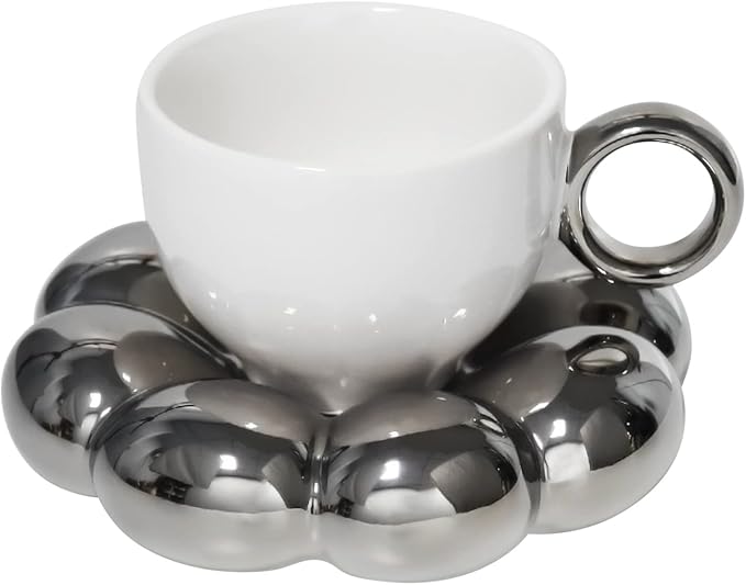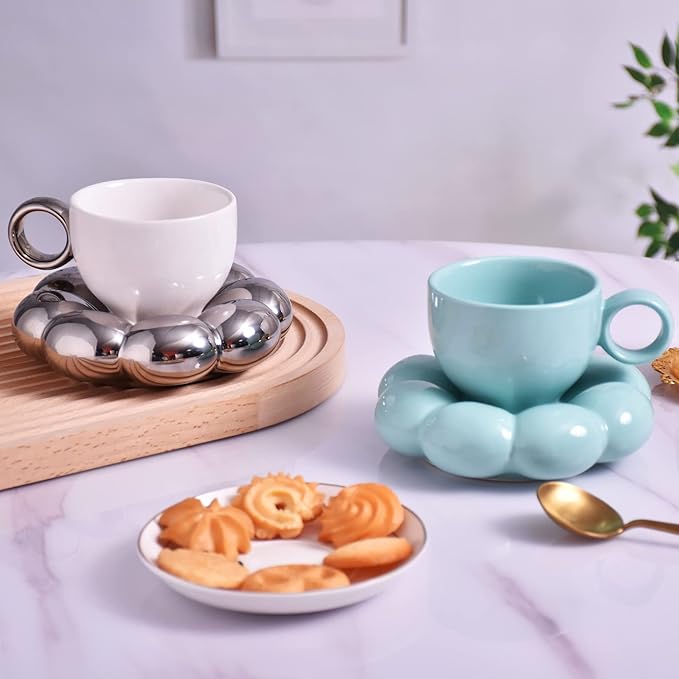 Koythin Ceramic Coffee Mug with Saucer Set, Creative Cute Cup with Sunflower Coaster for Office and Home, 6.5 oz/200 ml for Tea Latte Milk (Electroplating White and Silver)