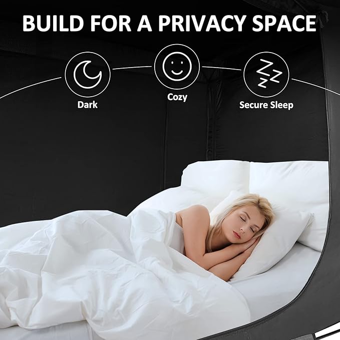 - EASY ACCESS-WITH 3 DOORS: This twin bed tent has three entrance doors with double zippers that can be opened or closed inside and outside for your easy access. Each door has two layers of panels: the first layer is breathable mesh fabric, which ensures good ventilation and brings a gentle sleeping breeze; the second layer is black sponge fabric, which reduces the light by 70%, so you can enjoy a purer sleep during the day or night.