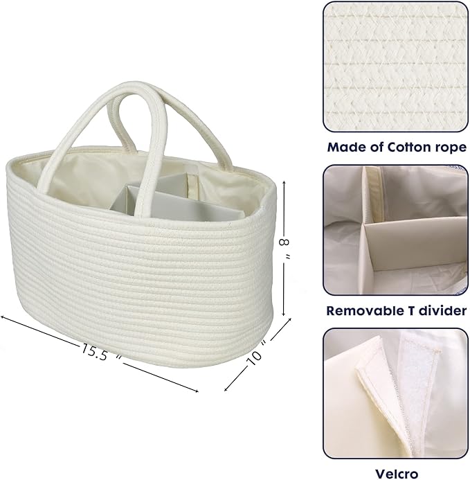 Large Baby Diaper Caddy Organizer for Girl Boy Rope Nursery Storage Bin Basket Portable Holder Tote Bag for Changing Table Car Travel Baby Shower Gifts Newborn Essentials Registry Must Haves White