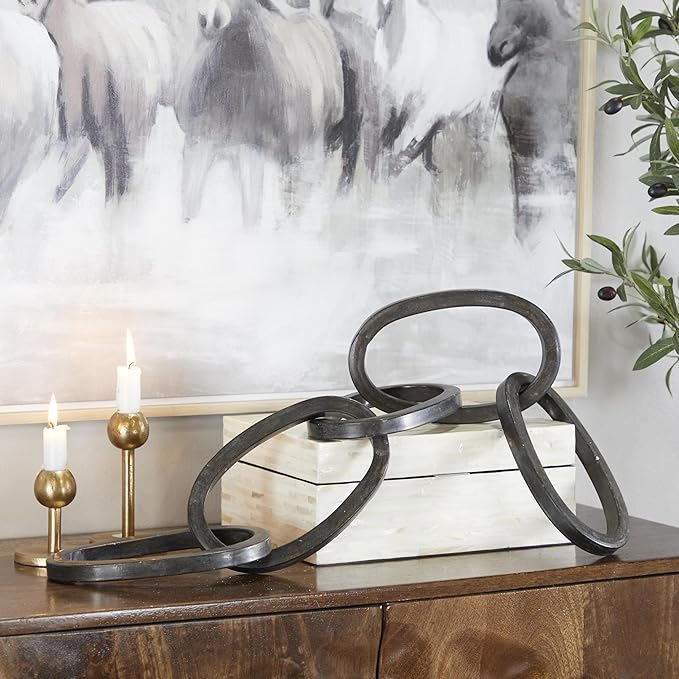 - CHAIN GEOMETRIC ACCENT STATUE: This metal sculpture featuring five links locked together to create a unique chain structure that can be displayed clustered together or spread across any tabletop