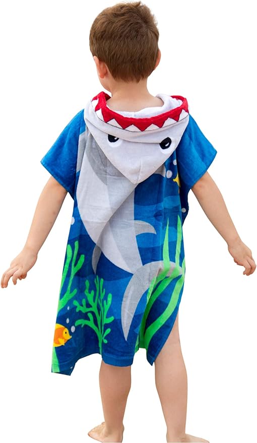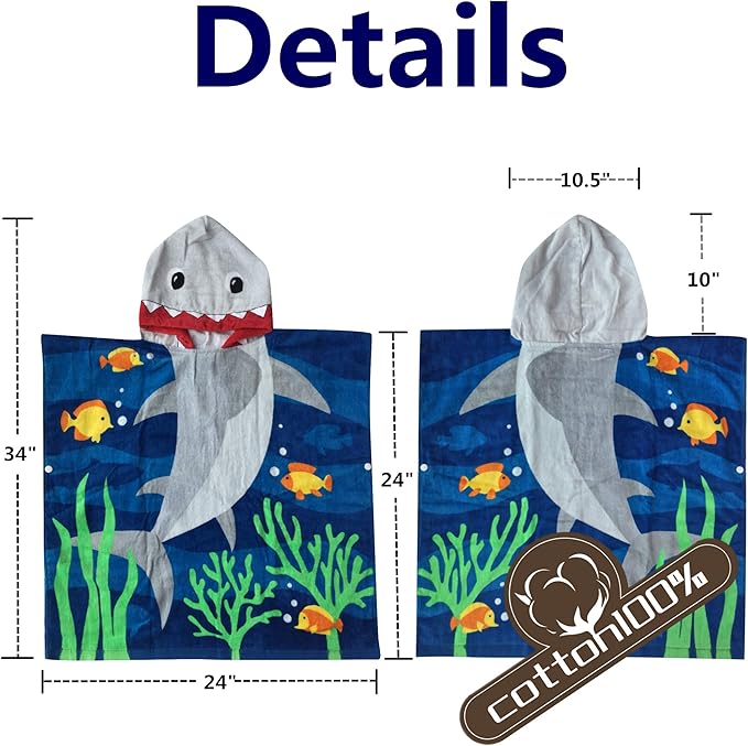 Soft Cotton Catroon Shark Towel Poncho for Kids Bath Beach Pool Swim with Drawstring Bag