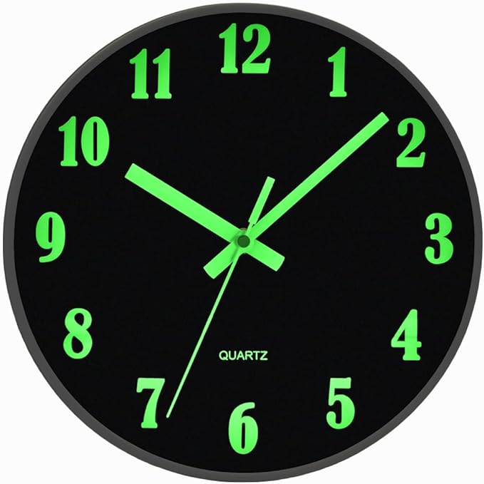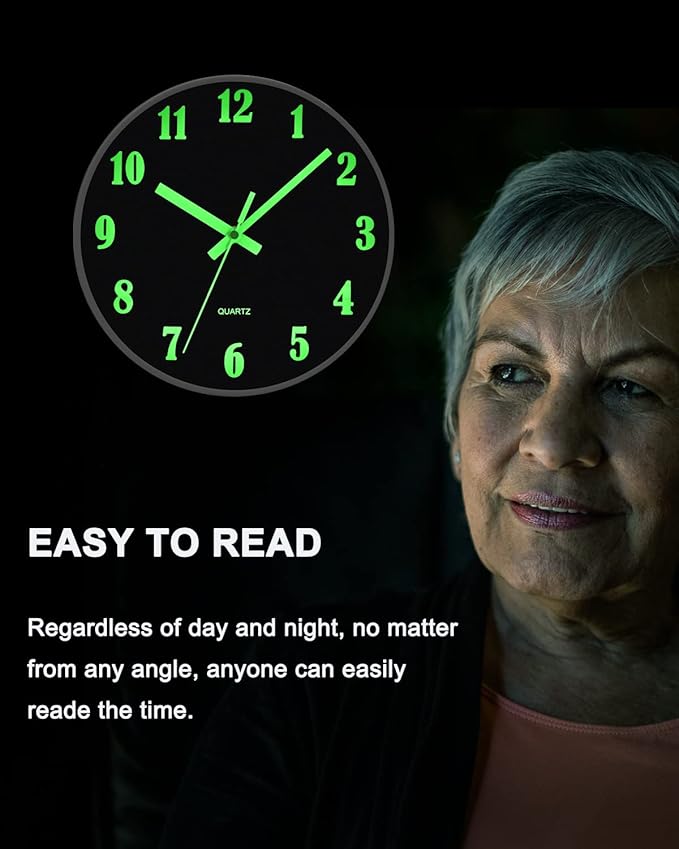 - ❶ 【Glow in The Dark】 The numbers and hands which have night light function. It asks for absorbing enough light energy during the day. At night, it is released in a fluorescent manner, so you can see the light at night or in the dark.(The wall clock will glow in the dark for 3-6 hours or so, The glow time depends on the light absorbed in the day, The brightness of noctilucent gradually decreases, and it can't stay at its brightest all the time.)