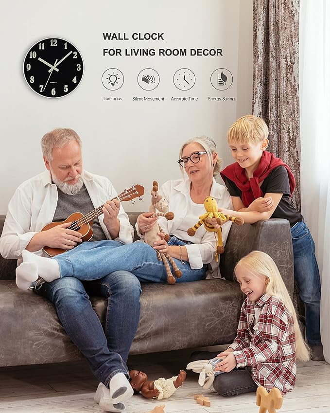 - ❷ 【Easy to Read】 Design with large numbers contrast to the black face, which makes reading the time easy from any angle. Awesome modern look wall clock perfect for dining rooms, living rooms, family rooms, bedrooms, study room,kitchen, office and meeting room.