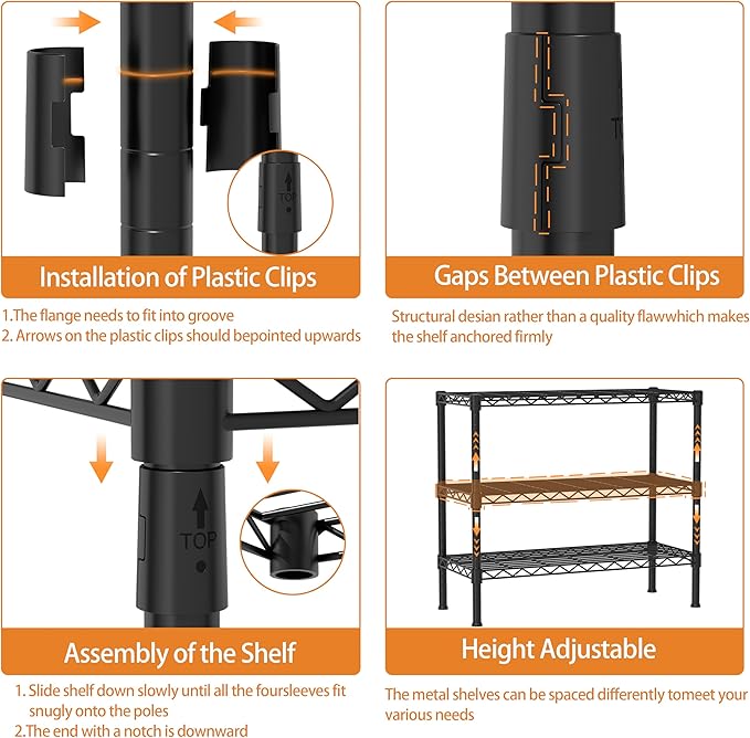 - 【Easy to Assemble】A rubber mallet is recommended, but it's not included. Just be sure to read the assembly directions carefully BEFORE you start putting it together. Certain shelves must be installed in a particular order the position of the shelf assembly can be adjusted according to your needs. Moreover, the height can be adjusted with a slip-sleeve locking system by increments of 1 inch each time.