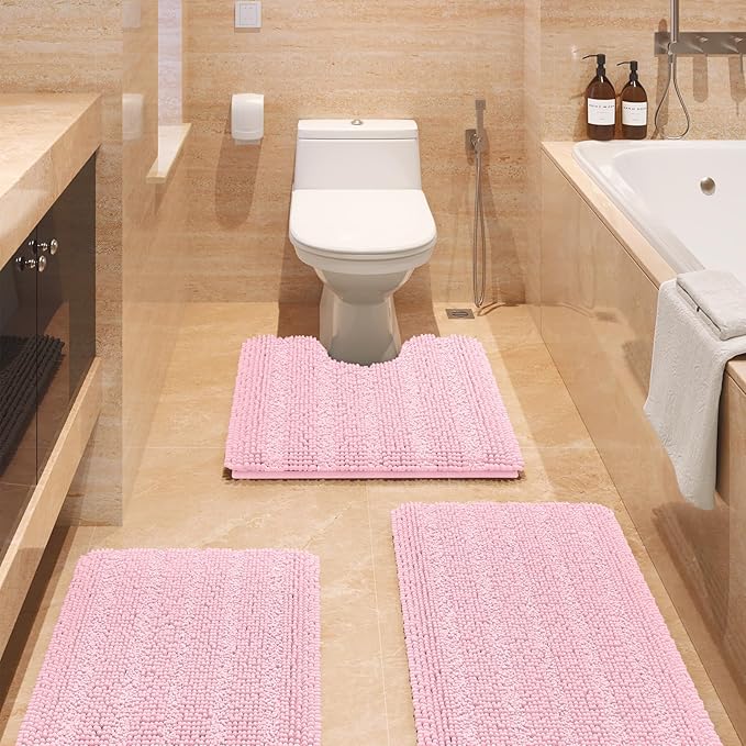 ACCUMTEK Striped Pink Bathroom Rug Set 3 Pieces Ultra Soft, Non Slip Chenille Toilet Mat, Absorbent Plush Shaggy Bath Mats for Bathroom, Bedroom, Kitchen