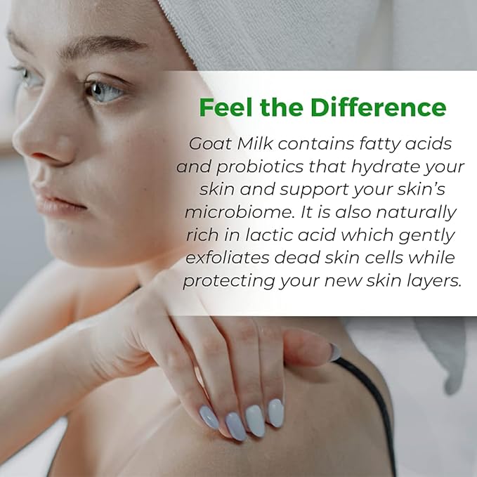 - THE SKIN BENEFITS OF GOAT MILK: Goat milk works wonders for your skin. Enriched with fatty acids and probiotics, it nourishes and hydrates, fostering a healthy skin microbiome. Additionally, its natural abundance of lactic acid gently sloughs away dead skin cells, safeguarding and promoting the emergence of fresh, revitalized skin layers.