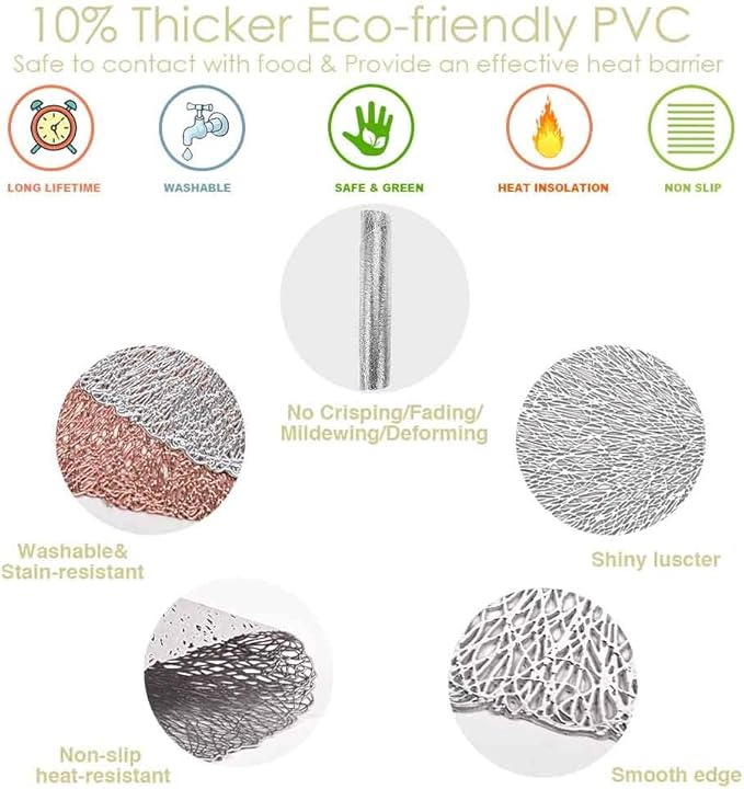 - Premium Material: Made of food-grade PVC material, safe to contact with food directly. 10% thicker than normal placemat and won't crisp, fade or deform. Ultra-durable, UV resistant, fadeless for both indoor and outdoor long-term everyday use