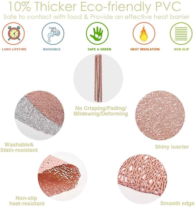 - Premium Material: Made of food-grade PVC material, safe to contact with food directly. 10% thicker than normal palcemat and won't crisp, fade or deform. Ultra-durable, UV resistant, fadeless for both indoor and outdoor long-term everyday use
