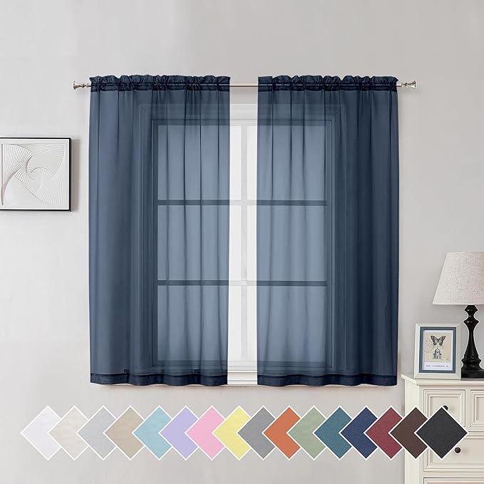 Aiyufeng Navy Blue Sheer Window Curtain Panels 54 Inch, Set of 2, Light Filtering Solid Voile Kitchen Curtains Drapes for Small Window/Kid's Room/Bathroom/Living Room/Bedroom, Rod Pocket, 40W x 54L