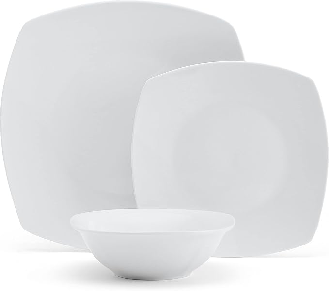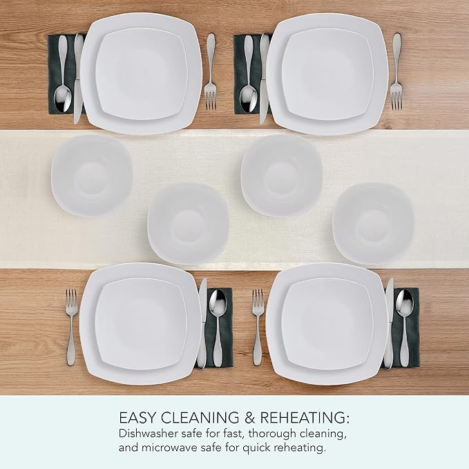 - BRIGHT AND BASIC: simple white dinnerware with a modern coupe square design enhances the look of your place settings and highlights your favorite stemware and flatware