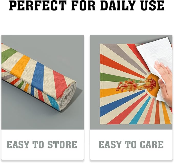 - ★【Double-Sided Printing】:The washable placemats are double-sided printing, high-definition printing technology, vivid colors, and clear patterns. These Colorful Boho plate mats with Rustic Retro Rainbow 70s Sun patterns are colorful and clear, adding more fun to your home.