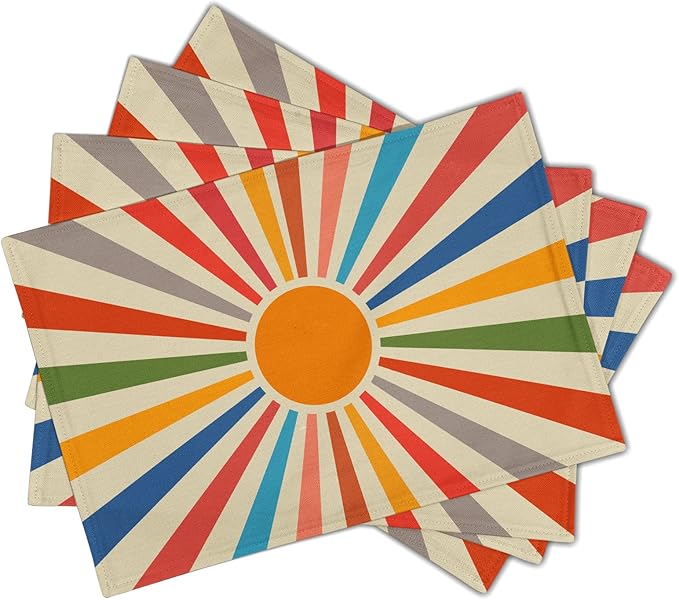 Colorful Boho Placemats Set of 4 Rustic Retro Rainbow 70s Sun Linen Washable Kitchen Dining Table Mats Stain Heat-Resistant Desktop Decor Place Mats for Home Party Indoor 12x18 in