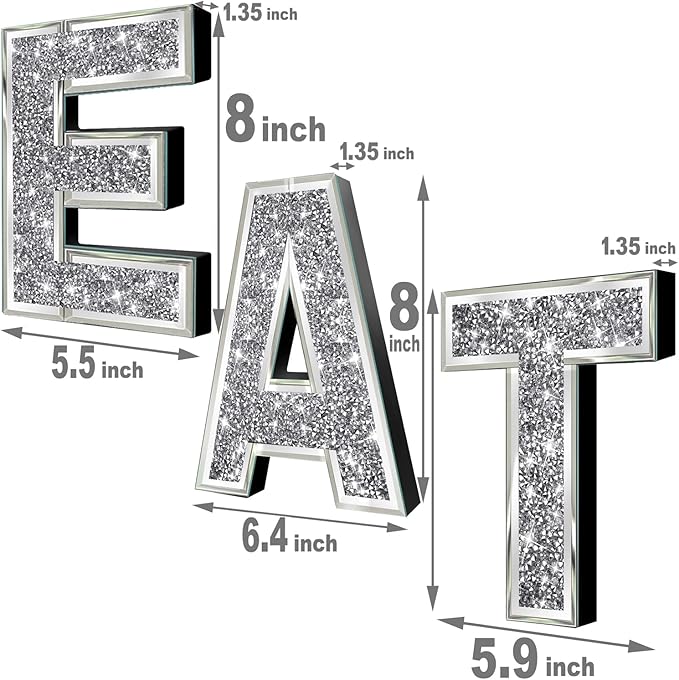 - INDEPENDENT:This set of EAT is composed of four independent letters. Each letter is very thick and heavy. This is a set of high-quality letter decoration signs. Shiny crystal diamonds are attached to the wood,every silver mirror with a beveled edge covers the diamond just right. It is extremely sparkly.