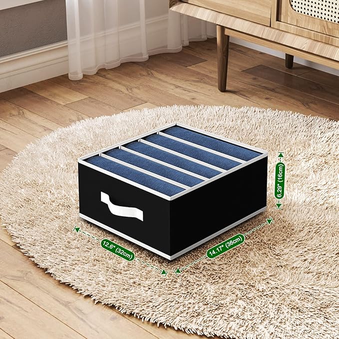 - 【Multipurpose】These pants storage bins are 14.17*12.59*6.29 inches and can be used as jeans organizer, sweater organizer for closet, bra organizer for drawer, suitable to store jeans, sweater, dresses, hoodies, etc. The closet organizers are suitable for your wardrobe, shelf, drawer, etc.