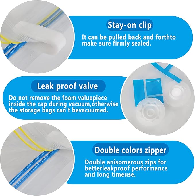 - Space bags with robust double zipper: stay-on clip prevents clips from falling off the zipper or missing. You never have to find the bag useless only because the small clip is missing. To add more, Separating the zipper when opening the bag is not a challenge any more! The zipper has one lower side and one higher side. You can feel them apart easily.