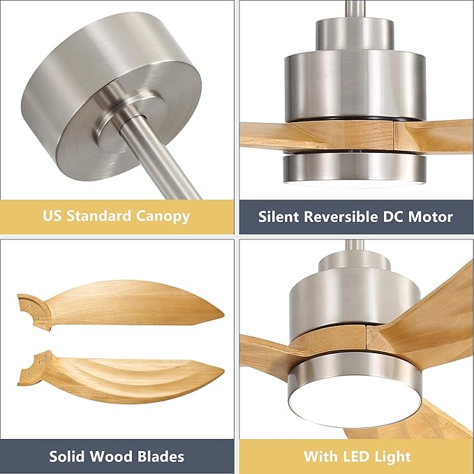 - ✔Modern Design : This 52-inch indoor ceiling fan with light is coated in nickel with 3 pieces of wood blades. Wood and metallic nickel color scheme makes the ceiling fan delicate and be of great taste.