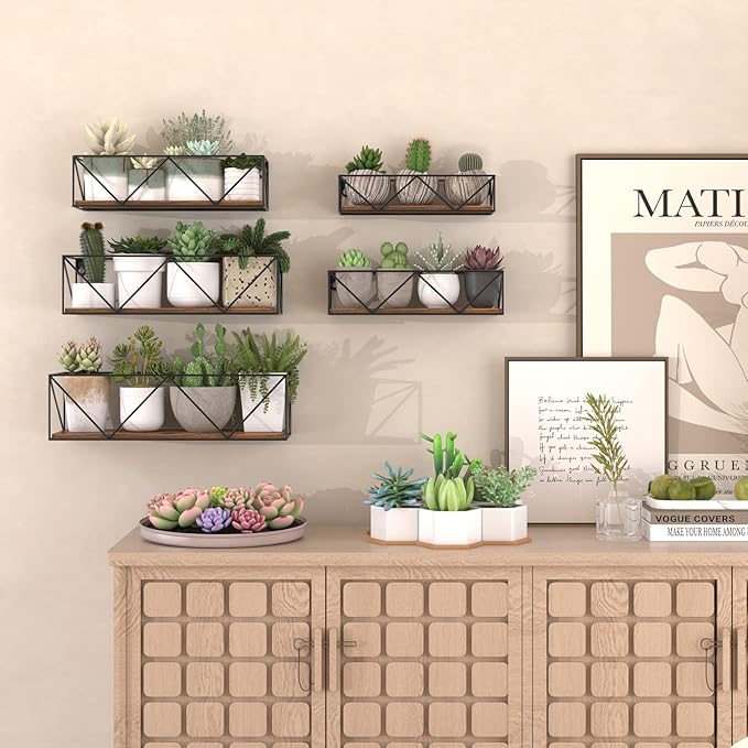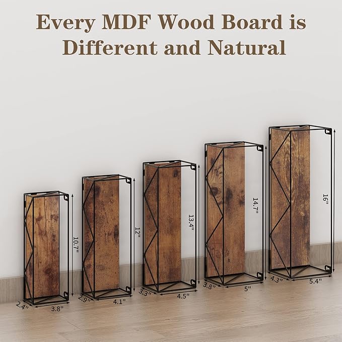 - Wall Shelves Material: these hanging wall shelves are constructed of composite wood and black metal bracket, which are sturdy enough to hold a certain amount of stuff about 24lbs for each size of 5 wall shelves.