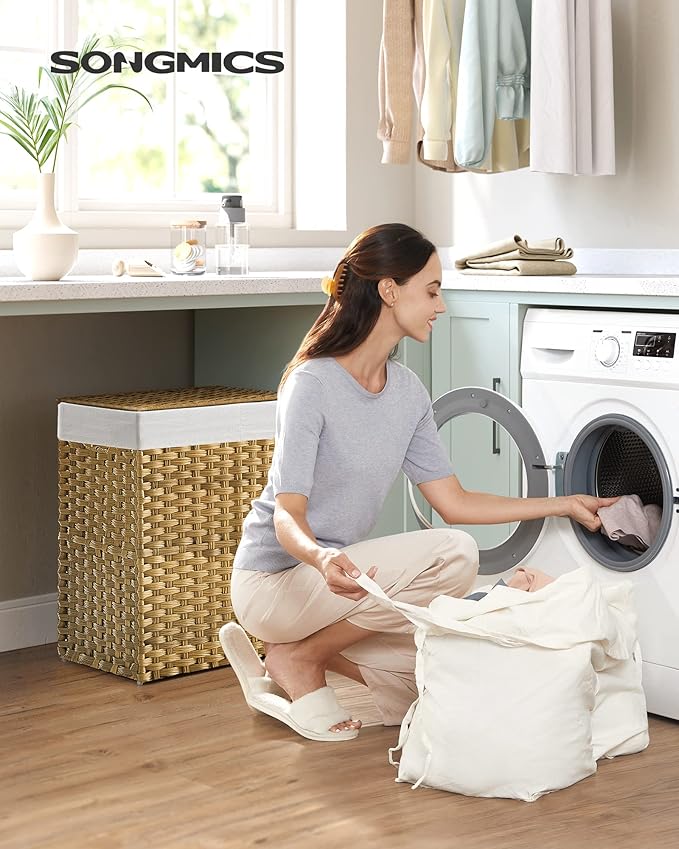 SONGMICS Laundry Hamper with Lid, 90L Clothes Hamper with 2 Removable Liner Bags, 6 Mesh Bags, Wicker Laundry Basket, Double Laundry Hamper for Bathroom, 13 x 18.1 x 23.6 Inches, Natural ULCB251N01V1