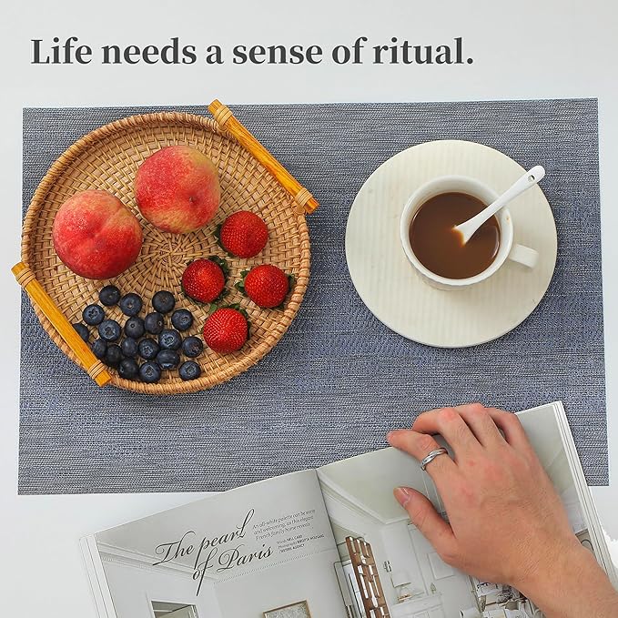 Leetaltree Denim Blue Placemats Set of 6 - Heat Resistant Non-Slip Place mats for Dining Table, Washable Durable PVC Vinyl Woven Table Mats(Denim Blue, 6)