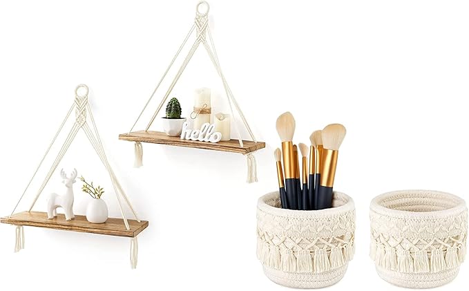 Mkono 4 Pcs/Set Macrame Hanging Shelves Boho Wall Decor and Makeup Brush Holder Organizer Mini Storage Baskets